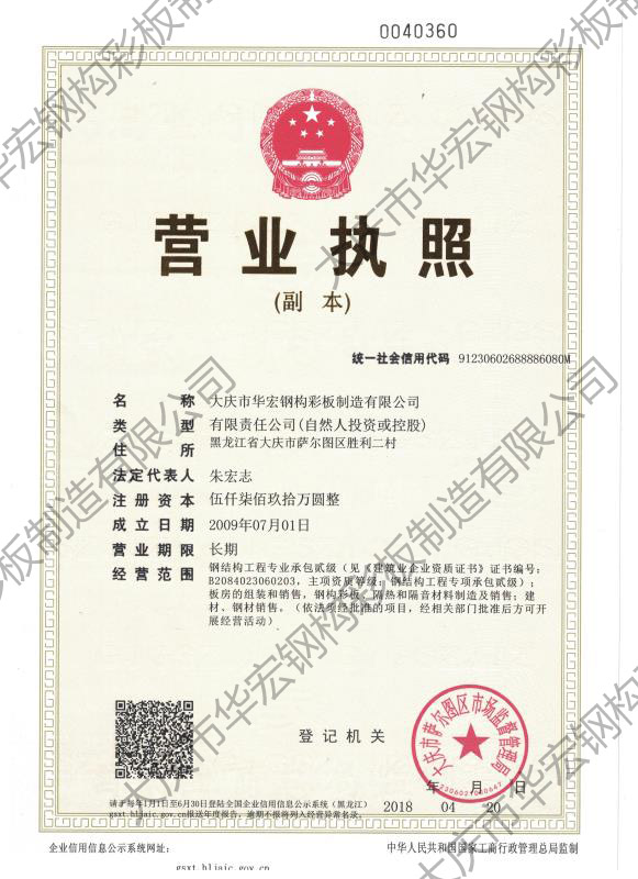華宏鋼構始建于2009年8月9日,總部位于大慶市薩爾圖區(qū)南一路13號,現(xiàn)有大慶市華宏鋼構彩板制造有限公司、黑龍江省華宏力安綠建科技有限公司、大慶市華宏鋼構彩板制造有限公司長春分公司、黑龍江省海森新材料科技有限公司、大慶市瑞和通螺栓廠五家工業(yè)企業(yè)形成了以彩板復合板、裝配式鋼結構建筑、保溫材料、配件制造為主的五大生產基地,占地總面積 20余萬平方米,生產車間5萬平方米。中高層管理干部26 人,高級工程師9人,各類國家注冊執(zhí)業(yè)人員 32 人,車間技工 260人,專業(yè)安裝隊伍 10 余支,帶動就業(yè) 500